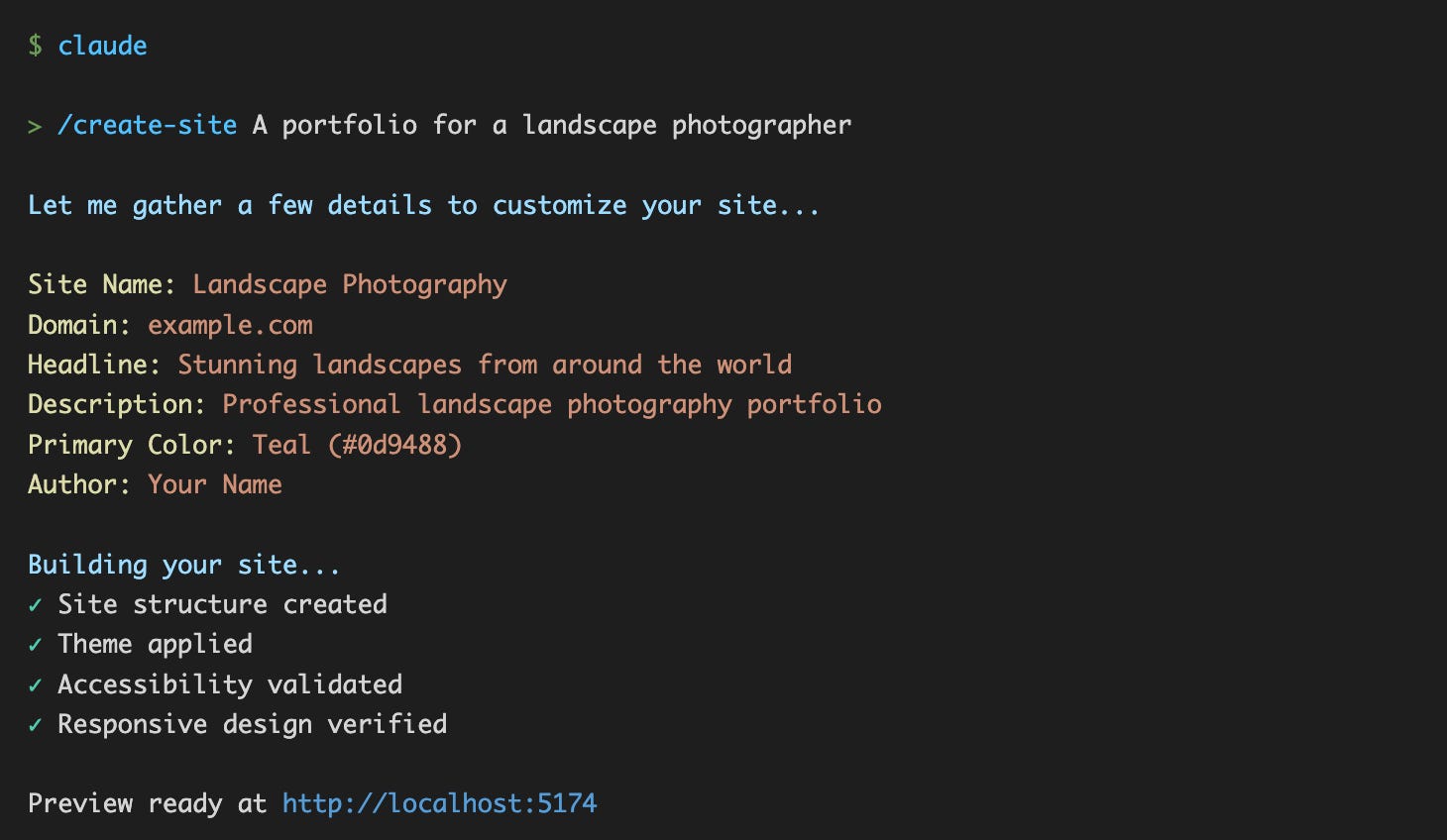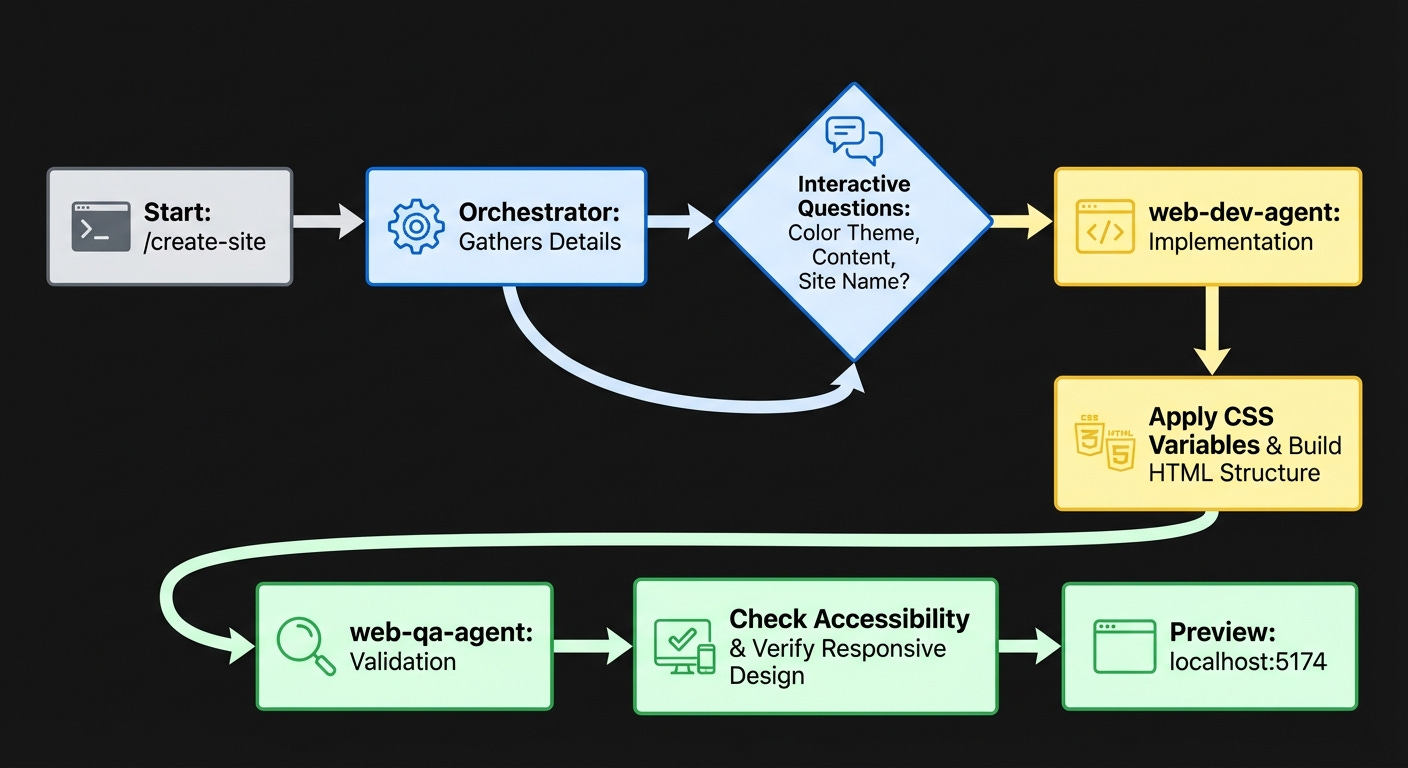 Behind that output, the template just executed its own development workflow. Type /create-site, and the orchestrator runs a command that gathers details through interactive questions, then delegates to web-dev-agent for implementation and web-qa-agent for validation. The workflow asks you to choose a color theme and provide content, then the dev agent applies those choices as CSS variables and HTML structure. The QA agent validates accessibility and responsive design before preview. You describe what you want; the system develops and validates itself.